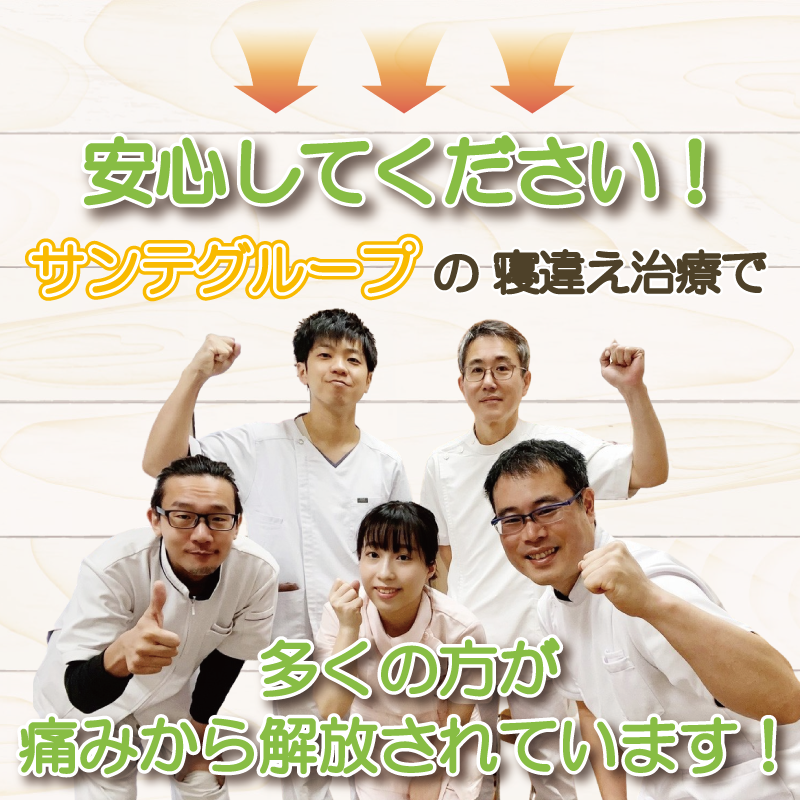 寝違いで辛いまま仕事をするより、駆け込み寺の如くサンテ整骨院グループに来て治療して、快適な状態で仕事をしてください。